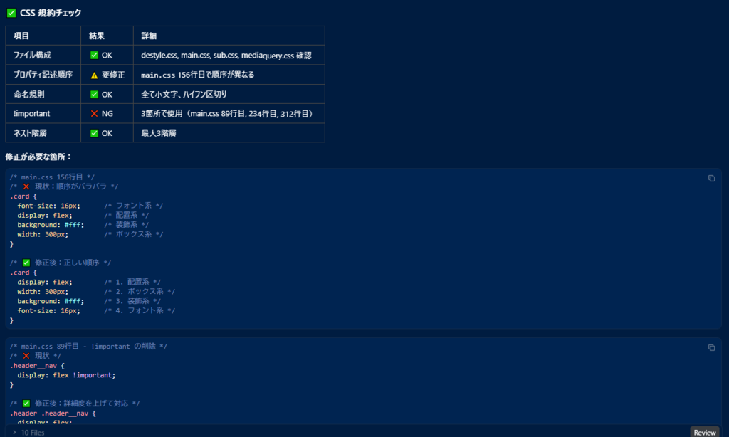 これらの画像は1枚目の画像の中の『reference』 > 『coding_manual』の中のmdファイルの中身とこのマニュアルに沿ってチェックしてくれた結果です。
